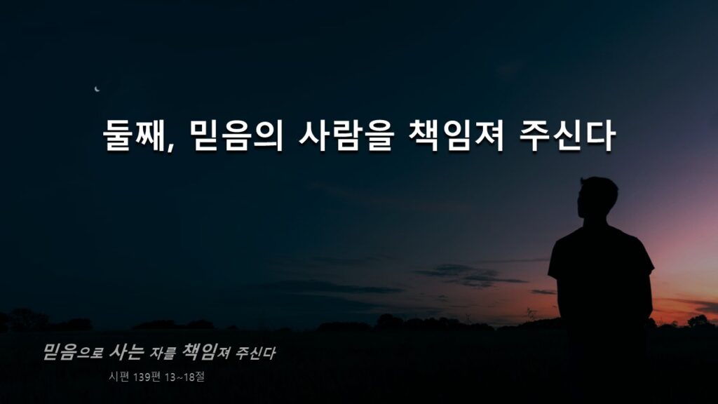 둘째, 믿음의 사람을 책임져 주신다. 다윗은 본 시편 1~18절을 기록하면서 하나님께서 나의 마음과 생각과 행위와 말과 상황까지 너무나도 잘 알고 계신다고 세 단락에 걸쳐 노래했습니다. 왜 그런 시를 썼겠습니까? 하나님께서 우리의 형편을 잘 아시고, 우리의 마음과 믿음을 보시고 은혜를 베푸시고, 도우시고, 구원하실 것을 믿음으로 고백하고 있는 것입니다. 믿음의 사람을 끝까지 책임져 주실 것을 말하고 있는 것입니다.