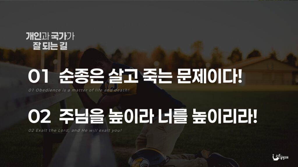 한 개인과 국가가 잘 되는 두 번째 방법은 ‘주님을 높이라 그리하면 너를 높이리라’는 것입니다. 여러분도 직장을 다니실 것이고, 여러분에게도 부하 직원 이 있을 수 있고, 여러분이 가게나 회사를 경영하면서 월급을 줘야 하는 직원 이 있을 것입니다. 그래서 여러분이 부하 직원에게 뭔가를 지시했습니다. 그런데 그 직원이 여러분의 말을 요즘 아이들 말로 씹었습니다. 무시했다는 겁니다. 만약 그렇다면, 직장 상사로서 또는 사장으로서 그 부하 직원 에게 어떻게 하겠습니까? 나의 지시와 말을 무시했다는 것은 곧 내 인격을 모독하는 것과 같은 겁니다. 때문에 그런 직원에게 결코 좋은 게 흘러갈 수 없을 것입니다.