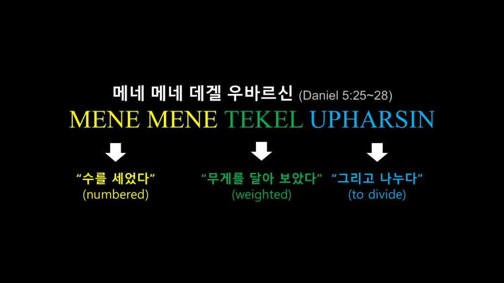 ‘메네(MENE)’는 ‘수를 세었다(numbered)’란 뜻이고, ‘데겔 (TEKEL)’은 ‘무게를 달아 보았다(weighted)’란 뜻이고, 마지막으로 ‘우바르신(UPHARSIN)’이란 말은 ‘그리고 나누다(to divide)’란 뜻입니다. 하나님께서 대제국 바벨론의 벨사살 왕을 저울로 달아보니 부족했다는 것입니다. 그래서 그 왕의 나라의 시대를 끝 나게 하시고, 그 왕의 나라를 나누어 메대와 바사 사람에게 준다는 것입니다. 그 땅의 주인이 바뀌게 된다는 것입니다.