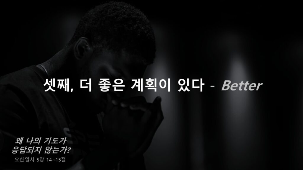 셋째, 더 좋은 계획이 있다(Better). 우리가 어떤 기도를 드렸을 때, 하나님께서 그 기도대로 응답하시지 않는 경우가 있습니다. 그럴 때 우리는 ‘왜 그러시지? 왜 내 기도대로 응답하시지 않지?’ 이런 생각이 들 수 있습니다. 그런데 하나님은 우리보다 더 크고 높으신 분이시고, 우리가 미처 다 생각하지 못하는 부분까지 헤아리시는 분이십니다. 우리 자녀들도 자기 생각과 계획이 있지만, 부모는 그 자녀를 위해 언제나 더 큰 비전과 계획을 갖고 있듯이, 하나님 아버지는 우리보다 더 큰 계획을 갖고 계신 것입니다.