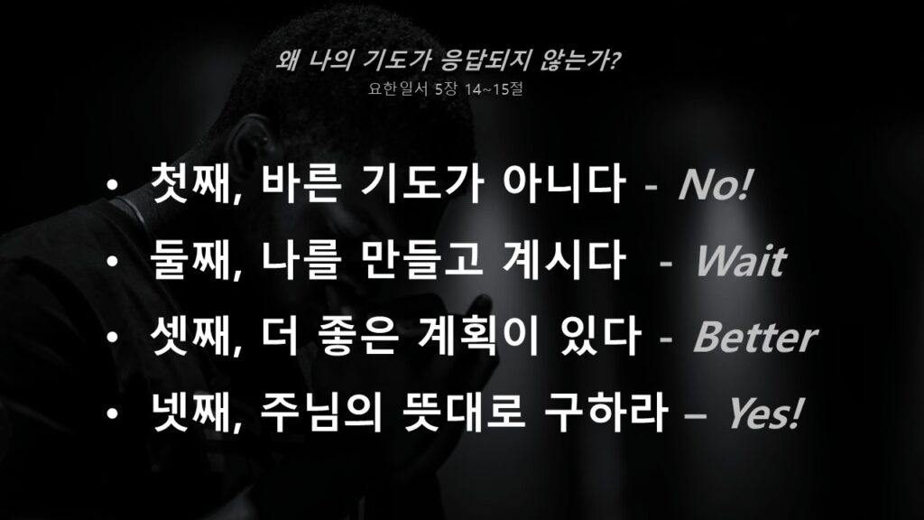 첫째, 바른 기도가 아니다(No!). 성경에는 ‘기도하라’는 말씀이 참 많이 나옵니다. 그리고 기도할 때 하나님께서 응답하신다는 약속의 말씀도 많이 나옵니다. 그런데 아무리 기도해도 응답되지 않는 기도가 있는 것이 우리 기도 생활의 현실이기도 합니다.