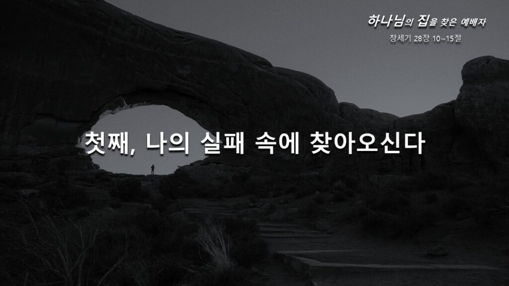 지금 야곱은 사랑하는 부모님을 떠나 낯선 땅으로 도피 중이었고, 언제 다시 고향으로 되돌아올지 기약이 없었습니다. 아버지께로부터 장자권의 축복기도는 받았지만 그 뿐이었지, 그는 빈손으로 고향을 떠나 낯선 타국으로 도피를 가던 중이었던 것입니다. 그때 하나님께서 야곱에게 나타나셨던 것입니다. 이렇게 하나님께서는 우리의 실패 속에 찾아오시는 주님이십니다.
