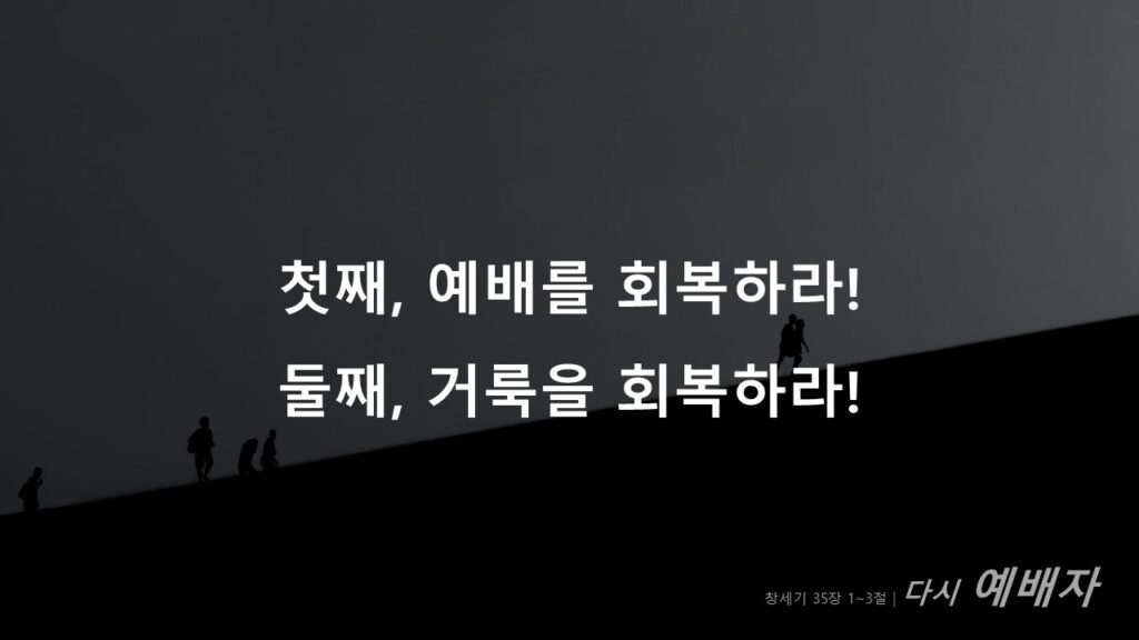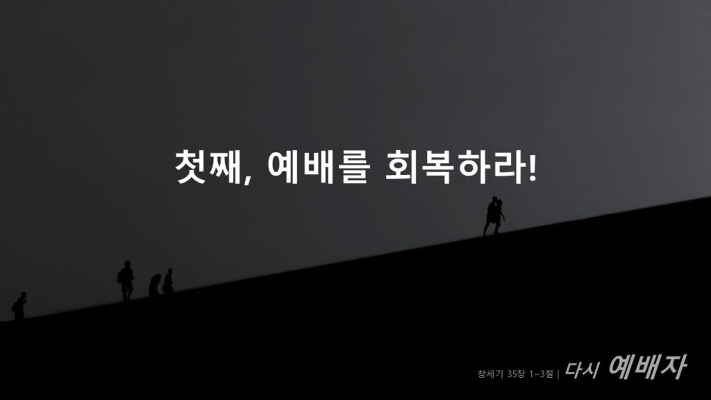 그리고 또 다른 말씀은 ‘거기서 제단을 쌓으라!’고 하셨습니다. 하나님께 한 약속(서원)을 지키라는 것이고, 온 가족의 예배를 회복하라는 말씀인 것입니다. 예배를 회복하는 것은 하나님과의 관계를 회복하는 것입니다. 2절 이하의 말씀을 보면, 야곱과는 달리 온 집안 사람들이 우상을 숭배하고 있었던 것을 보게 됩니다. 그래서 야곱뿐만 아니라 공동체로서의 야곱의 가문이 예배를 회복해야 하는 것입니다.