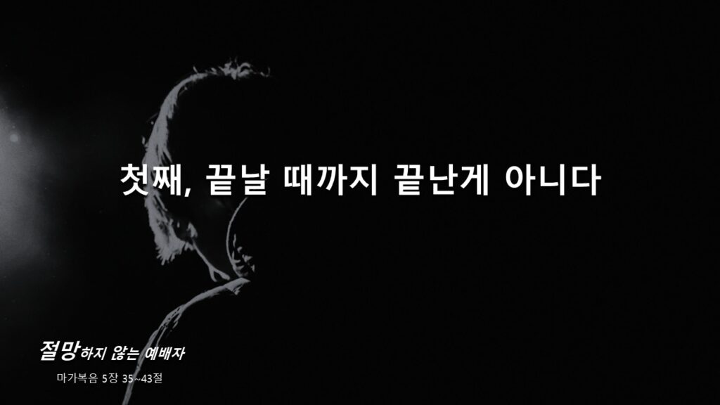 그 말에 야이로의 마음은 무너져 내렸을 겁니다. ‘아… 이제 다 끝났구나. 내 딸을 살릴 방법이 없구나. 더 이상 소망이 없구나…’ 그런 절망적인 마음에 하늘마저 무너져 내렸을 것입니다. 우리에게도 이런 절망적인 상황이 오기도 합니다. 세상은 우리를 향해 ‘너는 다 끝났다’고, ‘너에겐 더 이상 소망이 없다’고, ‘너에겐 희망이 없다’고 말합니다. 그런 말들과 그런 상황들 앞에서 우리 역시 절망적인 마음에 괴로워할 때도 있습니다.