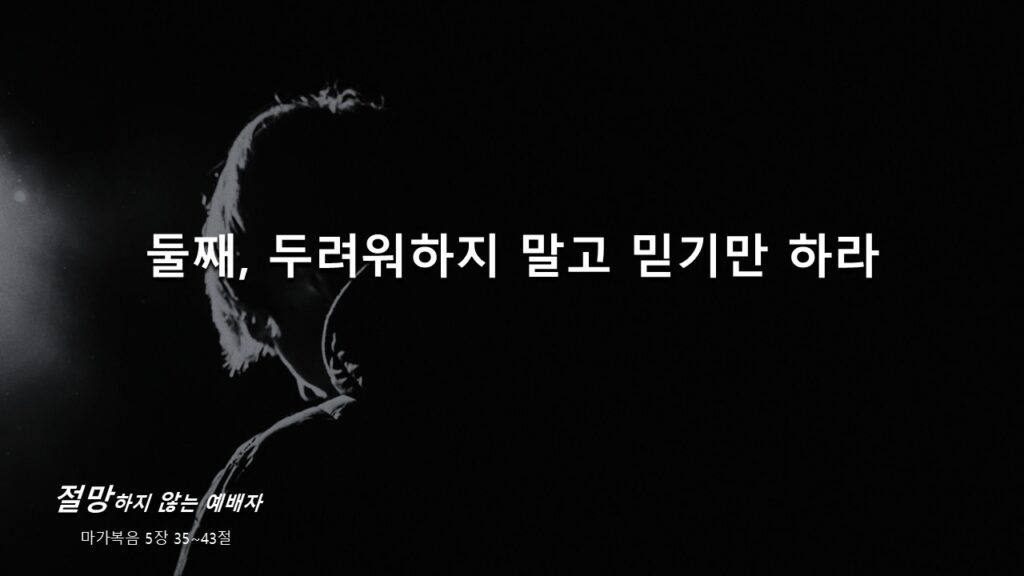 야이로의 집에서 온 사람들이 야이로에게 전한 말을 예수님께서도 그 곁에서 들으셨습니다. 우리에게 두려운 마음이 들 수 있습니다. 그런데 그 두려움을 이기는 것이 ‘믿음’인 것입니다. 내게 불가능한 문제, 내 힘으로 감당할 수 없는 문제, 희망이 보이지 않는 문제… 는 내게 두려움을 줄 것입니다. 하지만, 내가 믿는 전능하시고 살아계신 나를 사랑하시는 하나님을 믿는 믿음은 모든 두려움을 떠나가게 하는 것입니다.