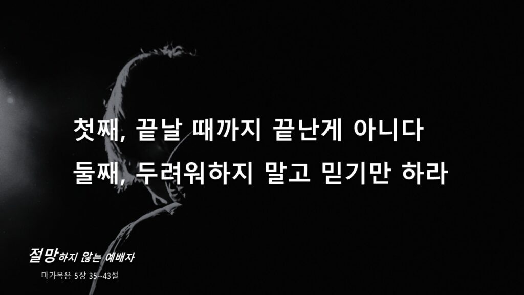 그러나 예수님께서 오늘 본문을 통해서 여전히 말씀하시고 있는 것처럼, 두려워하지 말고 믿기만 하십시오. 아직 끝나지 않았습니다. 끝날 때까지 끝난 게 아닙니다. 하나님께서 내게 행하실 일이 아직 남아 있는 것입니다. 내가 아직 숨쉬고 있고, 이렇게 두 눈 뜨고 살아있다는 것은 아직 하나님의 계획도 끝나지 않았다는 것을 말합니다. 내가 육신의 눈을 감고 천국에 들어갈 때, 비로소 우린 이 땅에서의 삶도 끝나는 것입니다. 때문에 어떤 상황에서도 절망하지 않는 믿음의 예배자 되시기를 축복합니다.