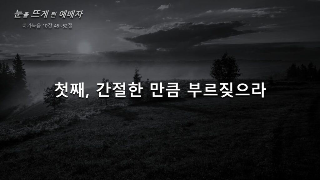 우리가 하나님 앞에 기도하는 소리와 기도의 양과 열정만 봐도 그가 얼마나 간절한지를 어느 정도 짐작해 볼 수 있는 겁니다. 정말 간절하면 그냥 1~2분 묵상기도하고 ‘기도 다 했다’라고 할 수가 없습니다. 시시때때로 기도의 집인 성전을 찾아와 기도할 것이고, 기도를 시작하면 부르짖고, 신음 소리와 통곡 소리가 섞여 하나님 앞에 간절히 기도하는 겁니다. 간절한 만큼 부르짖어 기도해 보십시오. 군중의 시끄러운 소음을 뚫고 주님이 바디매오를 돌아보셨던 것처럼 부르짖어 기도할 때, 새로운 역사는 시작되는 것입니다.