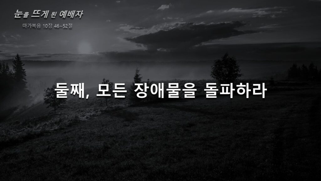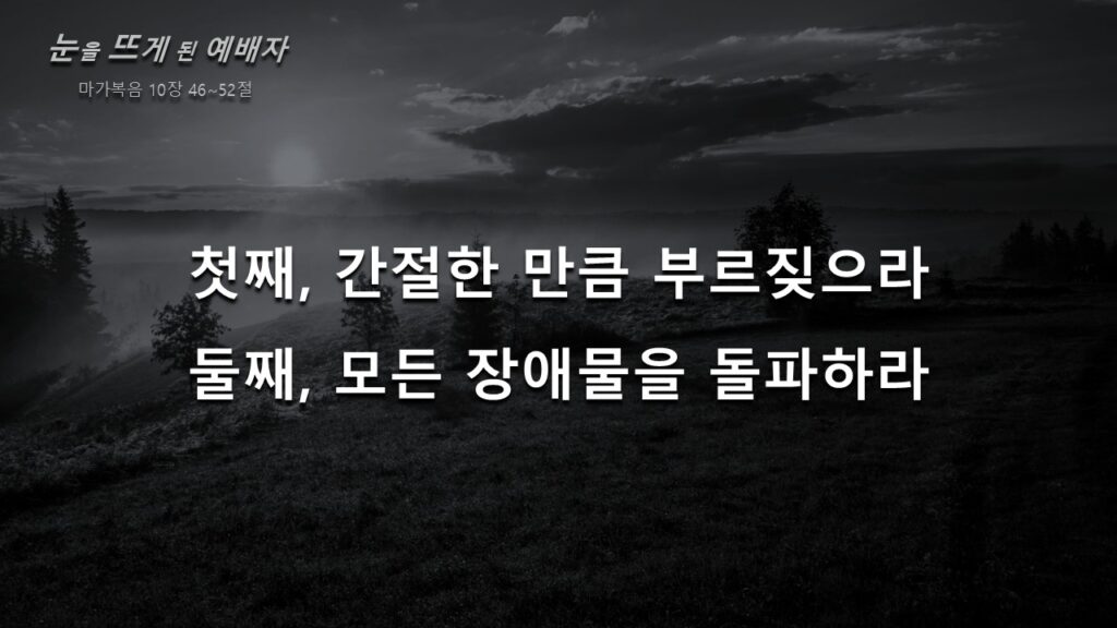 여러분이 어떤 꿈과 비전을 향해 나아갈 때, 먼저는 간절한 만큼 간절히 부르짖으며 기도로 준비하셔야 합니다. 우리가 기도할 때 하나님께서 일하십니다. 그리고 또 한 가지는 반드시 장애물들이 나타날 것입니다. 그러니 장애물들이 나타났다고 해서 낙심할 필요가 없습니다. 높은 산을 오르려면 극복해야 할 오르막이란 게 있는 것처럼, 여러분의 꿈을 이루는 데에는 반드시 장애물들이 있을 것이고, 기도하면서 하나님의 도움을 구하며 내적 외적 모든 장애물들을 돌파해 나가십시오. 바디매오가 눈을 뜨듯 내 인생의 새로운 역사가 써지기 시작할 것입니다.