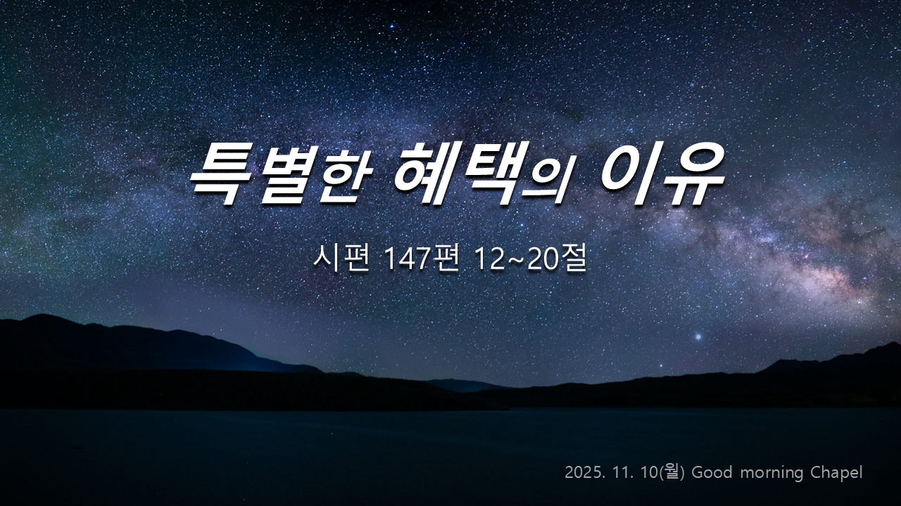 그렇게 자연을 움직이시는 위대하신 하나님께서 우리에게 특별한 혜택을 주셨는데, 19절과 20절을 보시면 “그가 그의 말씀을 야곱에게 보이시며 그의 율례와 규례를 이스라엘에게 보이시는도다. 그는 어느 민족에게도 이와 같이 행하지 아니하셨나니 그들은 그의 법도를 알지 못하였도다 할렐루야”
