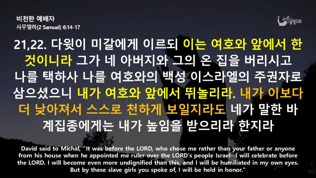 “다윗이 미갈에게 이르되 이는 여호와 앞에서 한 것이니라 그가 네 아버지와 그의 온 집을 버리시고 나를 택하사 나를 여호와의 백성 이스라엘의 주권자로 삼으셨으니 내가 여호와 앞에서 뛰놀리라. 내가 이보다 더 낮아져서 스스로 천하게 보일 지라도 네가 말한 바 계집종에게는 내가 높임을 받으리라 한지라”
