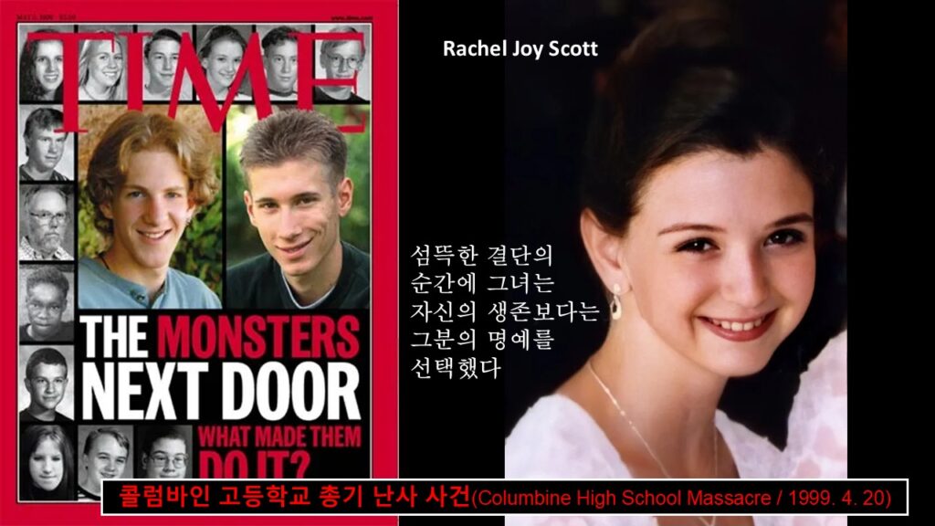 그들이 학교로 들어서자 독실한 크리스천인 ‘레이첼 스콧(Rachel Joy Scott)’이 잔디밭에 앉아 있는 것을 발견하고 그 소녀의 다리에 총 두 방을 쏘았고, 상체에 한 방을 더 쏘았습니다. 피투성이의 레이첼이 안간힘을 쓰며 기어 도망가려 하자, 그들은 레이첼의 머리채를 잡아채며 “하나님을 믿나?”라고 물었습니다. 그들은 그녀가 ‘안 믿는다. 제발 살려달라’고 애원할 줄 알았는데, 레이첼은 “(너희가) 알다시피, 나는 하나님을 믿는다!”라고 말했습니다. 그 대답에 눈이 뒤집힌 에릭과 딜런은 “그러면 그 곁으로 꺼져버려!”라고 소리치며, 총구를 레이첼의 머리에 대고 당겨 버렸습니다.