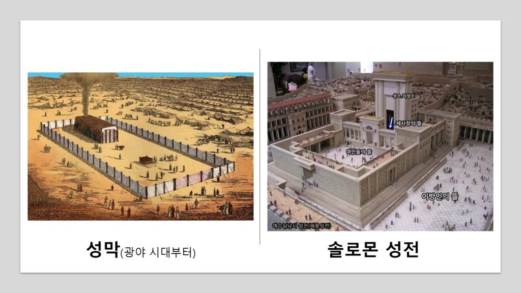 하지만, 그들이 하나님께 제사하며 예배할 곳인 ‘성막’과 ‘성전’이란 것을 만들도록 허락하셨습니다. 먼저, 이스라엘의 건국사에서 출애굽 이후 광야 생활이 시작될 때, ‘성막’이란