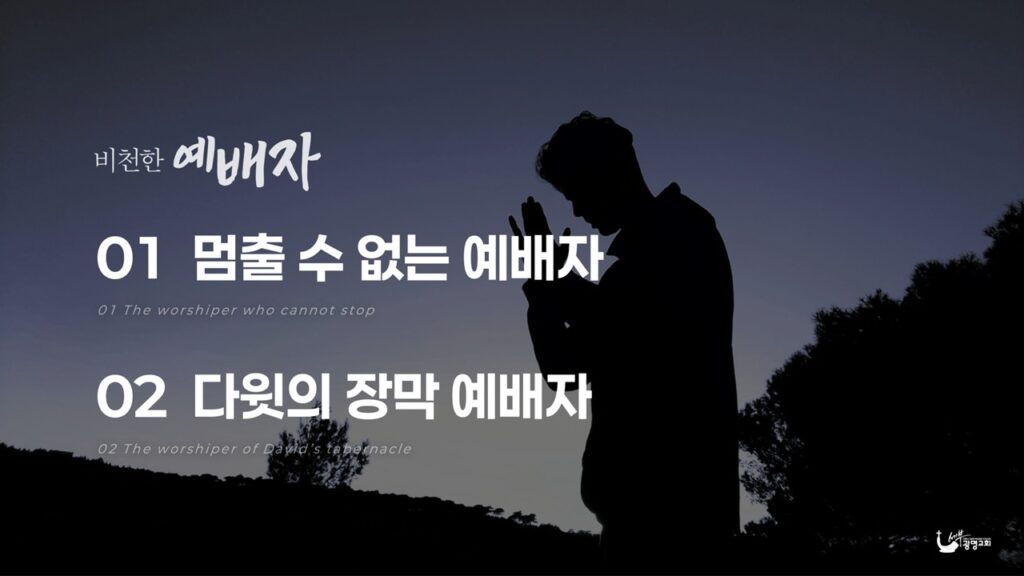 사람은 자꾸 큰 성전에 집중하지만, 하나님은 지금도 다윗의 장막을 그리워하고 계시는 것입니다. 우리 안에 회복되어야 할 예배는 화려한 음악과 영상과 교회와 대단해 보이는 무엇이 아니라, 다윗의 장막 예배인 것입니다. 오늘도 하나님께서 찾으시는 바로 그 한 사람이 되시기를 축복합니다.