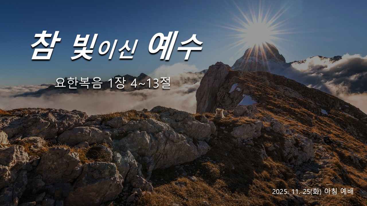 요한복음 1장 1~3절을 통해서 ‘예수님은 말씀이시다’라는 사실을 말씀하셨는데, 오늘 본문에서 ‘예수님은 참빛이시다’라는 사실을 말씀하시고 있습니다. 그런데 단지 어둠을 밝히는 전등 정도가 아니라, 4절에 보니깐 이 빛은 ‘생명’이라는 것입니다. 죽고 사는 문제가 달려 있다는 것입니다. 그런데 5절에서 사람들이 이 빛을 깨닫지 못하더라는 것입니다.