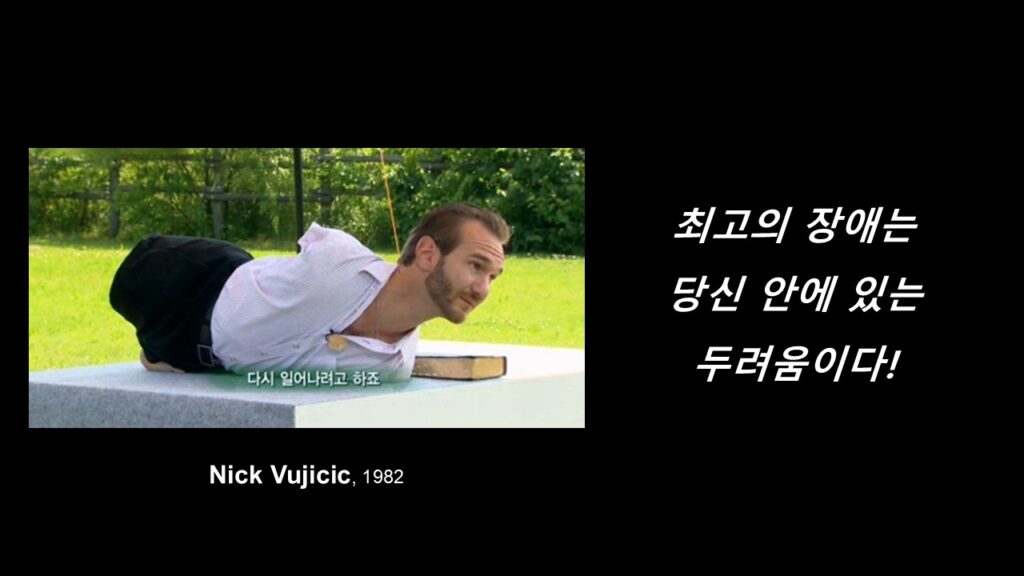 두 팔, 두 다리 멀쩡하고 건강해도 마음에 장애가 있으면 아무것도 할 수 없는 것입니다. 겉으로 보이는 것은 진짜 장애가 아닙니다. 닉 부이치치가 강연을 할 때, 꼭 두꺼운 성경책을 갖고 나갑니다. 그리고 자신이 넘어졌다가 다시 일어서는 시범을 보여줍니다. 팔과 다리가 없으니 머리로 두꺼운 성경을 딛고 힘겹게 다시 일어서는 겁니다. 세상 사람들은 ‘약한 자는 쓸모없다’라고 말하지만, 성경은 ‘약해도 쓰임 받을 수 있다. 이 말씀을 믿어라! 이 말씀이 너를 강하게 할것이다!’라고 닉 부이치치는 말하고 있는 겁니다.