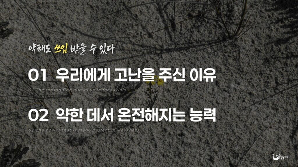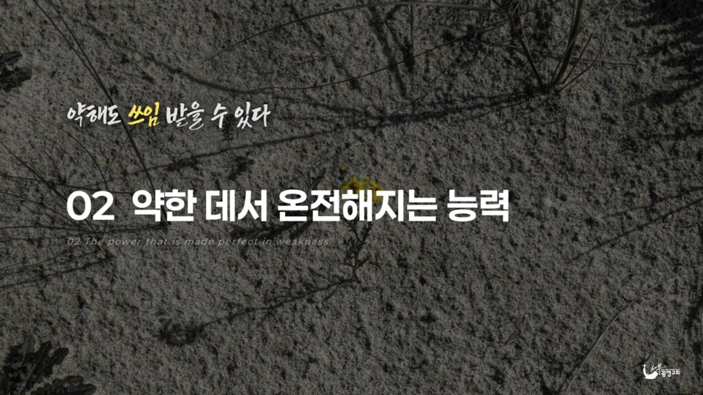 어느 누구도 약한 걸 좋아하는 사람은 없습니다. 자신이 약하면 선택받을 수 없고, 쓰임 받을 수 없고, 실패할 수밖에 없고, 결국은 살아남을 수 없다는 것이 이 세상의 질서이기 때문입니다. 그래서 우리는 더 똑똑해지려고, 더 강해지려고 노력하기도 합니다. 그런 사람만이 선택받을 수 있고, 쓰임 받을 수 있고, 성공하게 되고, 결국은 이 세상의 무한 경쟁에서 살아남을 수 있을 것이라 믿기 때문입니다.