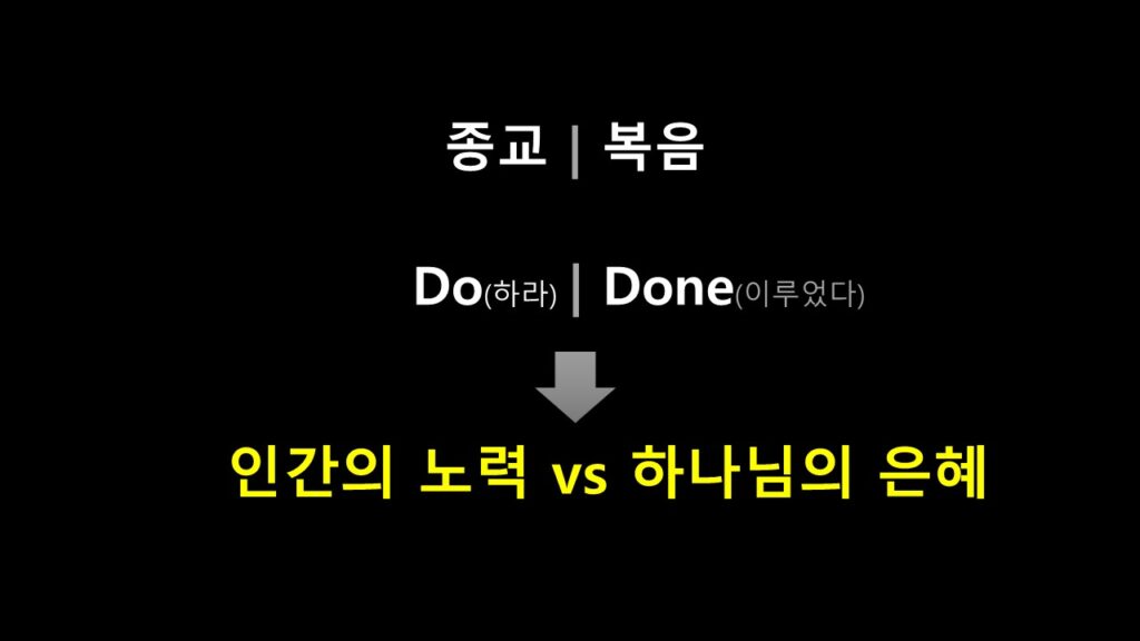 종교와 복음은 ‘Do(하라)와 Done(이루었다)’라고 할 수 있습니다. 수많은 종교들은 ‘이것을 지켜야 복을 받는다. 이렇게 해야 천국에 간다. 이것을 하라. 저것을 하라…’라는 식으로 수많은 규율과 율법을 지키도록 합니다. 하지만, 어느 누구도 그 수많은 규율과 율법을 완벽하게 지킬 수 있는 사람은 아무도 없기 때문에, 그들은 늘 벌 받을까 봐 두려움과 죄책감에 눌려 살 수밖에 없는 것입니다.