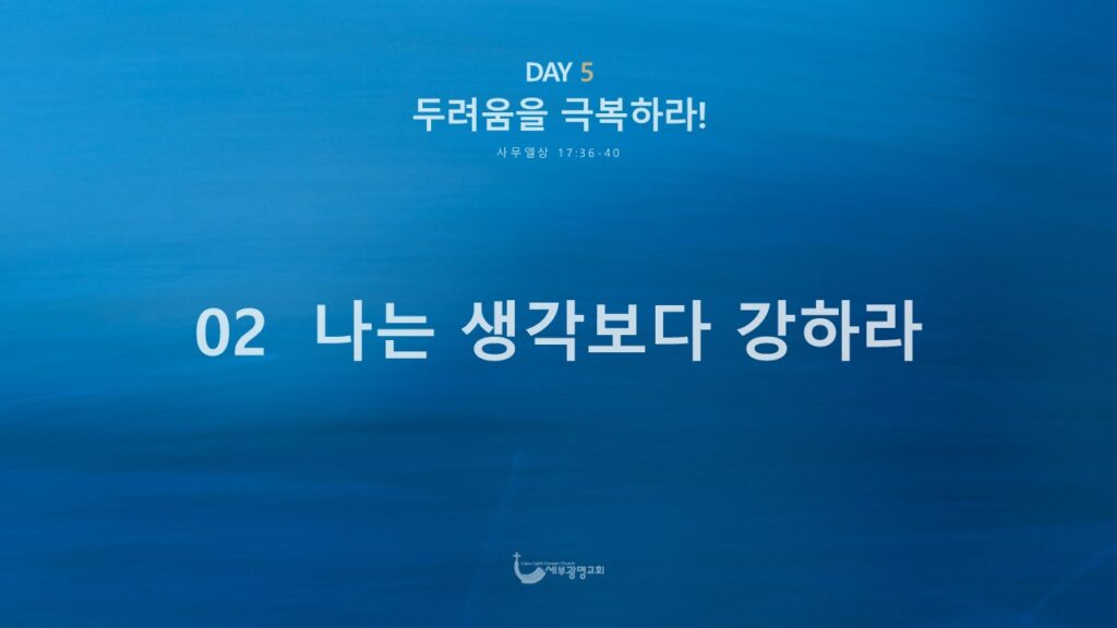 우리가 어떤 상황 앞에서 두려워하는 또 다른 이유 하나는 겉으로 보이는 것으로 비교하고 미리 판단하기 때문입니다. 내가 상대하기 어렵고, 감당하기 어렵다고 미리 판단하고 결정해 버린 겁니다. 내가 갖고 있는 건 보잘것없다고 판단해 버리는 겁니다. 나에겐 그럴만한 능력도 실력도 가진 것도 없다고 판단해 버리고 낙심해 버리는 것입니다.