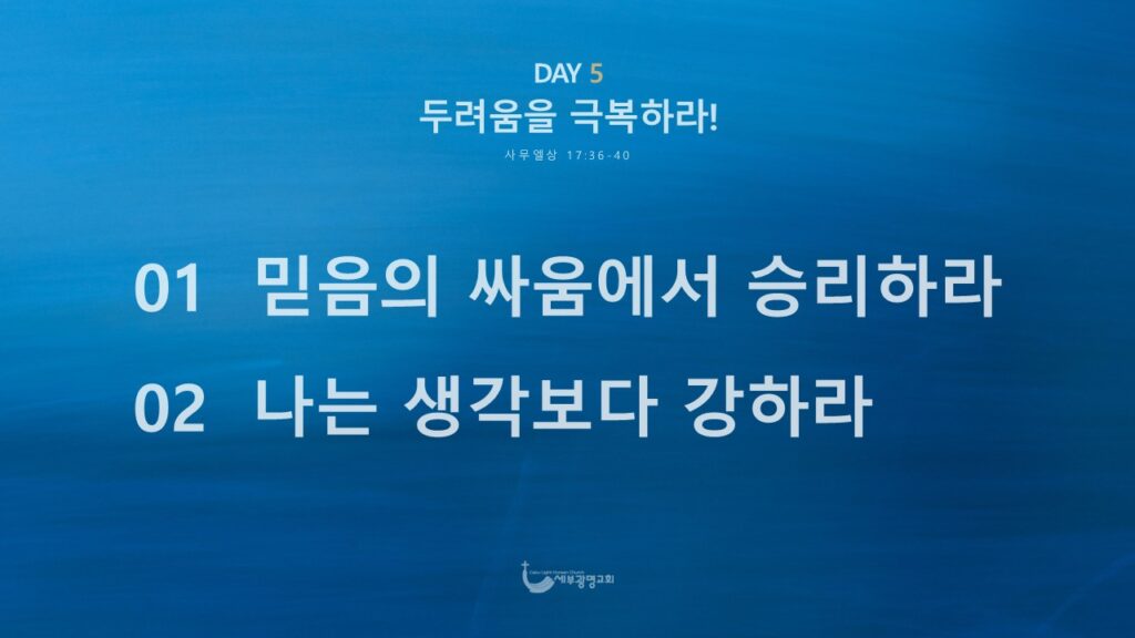 하지만, 다윗은 하나님만을 예배하니 그가 두려워할 분은 오직 하나님 뿐이셨던 것입니다. 그리고 그 하나님을 절대적으로 의지하며 나가니 골리앗도 두렵지 않았던 것입니다. 살다보면 여러 가지 상황들을 만나게 되는 우리의 마음에 어떤 두려움이 생긴다는 것은 자연스러운 일이지만, 우리가 그 일들 앞에 두려운 마음이 생기는 것은 혹시 우리가 그것을 의지하고 예배하고 있는 것은 아닌지 생각해 봐야 하는 것입니다. 오직 하나님만 예배하고, 주님만 의지하십시오. 골리앗 같은 문제를 만나도 이 믿음의 싸움에서 먼저 승리하십시오.