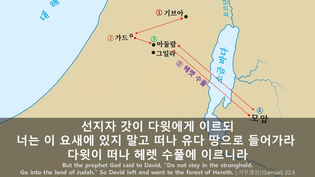 사울 왕의 왕궁 은 <기브아>라는 곳이었고, 다윗을 죽이 려는 사울 왕의 광기를 피할 곳이 없어 적국인 블레셋의 <가드왕 아기스>에게로 피했었지만, 그곳 역시 다윗의 생명을 노리던 이들이 있어 그곳에서 빠져나와 <아둘람 굴>로 피했던 것입니다. 하지만, 계속 부모님과 함께 있을 수 없 어서 부모님을 <모압 왕>에게 부탁을 하고, 그도 역시 모압 땅의 한 요새에서 그 상황이 잠잠해 지기를 기다리고 있었던 것입니다.