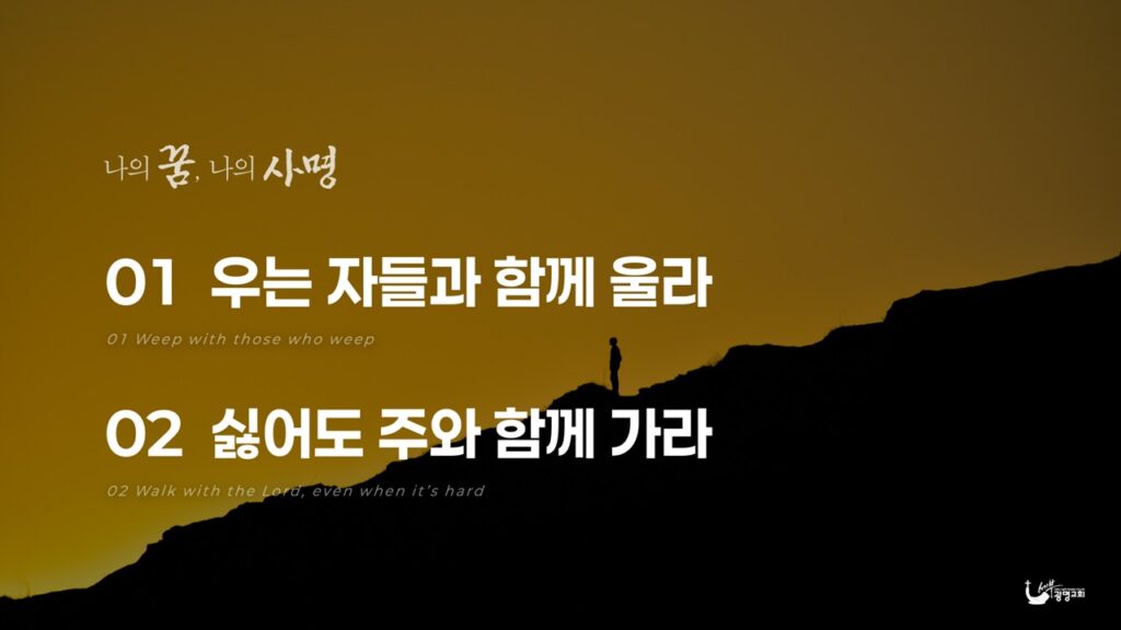 우리 부모님들이 자식 중에 아픈 아이가 있으면 밖에서 바쁘게 일을 하고 있어도 늘 그 아파하는 자식에게 마음이 가 있는 것처럼 , 하나님께서는 지금도 인생의 고통 속에서 울고 있는 이들을 주목하고 계십니다. 그래서 우리에게 어떤 꿈과 비전을 주실 때, 그냥 우리 한 사람 잘 먹고 잘살라고 하시는 게 아니라, 하나님께서 주목하고 계신 고통 받고있는 이들과 함께 울어주라고 그런 꿈과 비전을 주시는 것입니다.