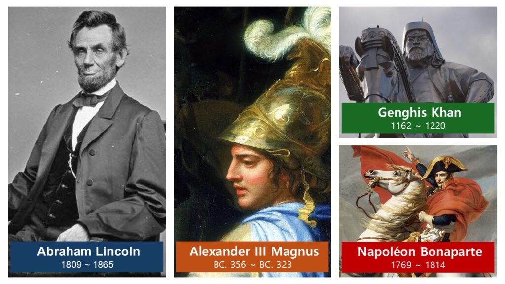 이 세 사람의 공통점은 모두가 뛰어난 군인이었고, 제국을 건설한 정복자였습니다. 그 리더 한 사람 때문에 각 나라의 역사에 큰 흔적이 남았습니다. 그런데 그들이 그리스와 몽골 과 프랑스 등 각 나라의 전쟁 영웅이겠지만, 반대로 그 주변 국가들로부터는 침략자로 여겨지는 사람일 것입니다.