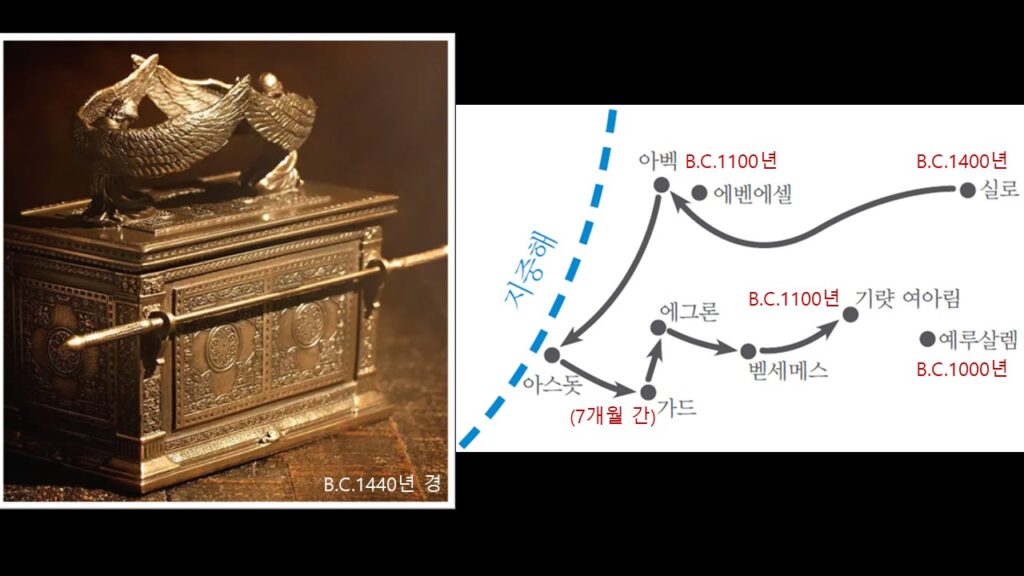 광야 생활 40년 뒤, 기원전 1400년경에 가나안 정복 전쟁이 시작 되고, 이스라엘이 가나안 땅에 입성한 뒤 ‘실로’ 라는 곳에 성막이 세워지고, 법궤도 그곳에 안치 되어 있었 습니다. 그 후 사사시대의 말기에 엘리 제사장의 두 아들이 전쟁터에 법궤를 들고 갔다가 블레셋 족속에게 그 법궤를 빼앗겼고 , 법궤는 이방 족속인 블레셋 사람들에게 약 7개월 동안 머물게 됩니다. 하지만 블레셋 여러 도시를 거쳐 가던 법궤로 인해 블레셋 각 성읍마다 큰 재앙 이 있었고, 그래서 법궤는 다시 이스라엘 사람들이 돌려받게 된 것 입니다. 그 때가 대략 기원전 1100년 경이었습니다.