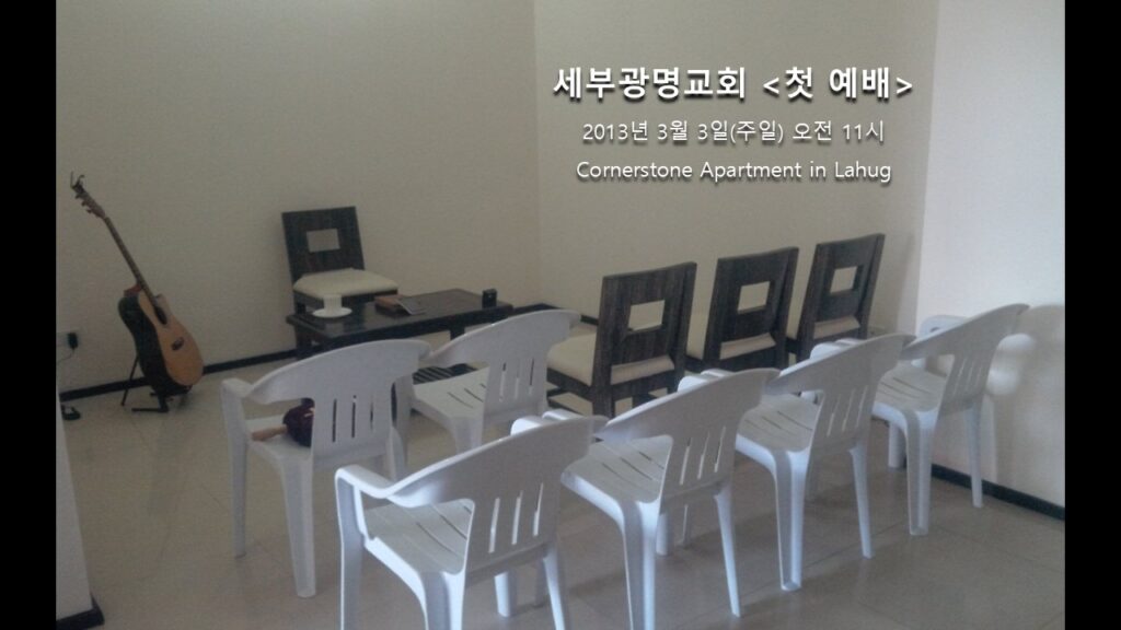 그리고 필리핀에서 맞는 두 번째 주일예배를 저희 집 거실에 의자 몇 개 놓고 시작하면서 우리 <세부광명교회 첫 예배>를 드리게 되었던 것입니다. 저희 가족들 4명하고, 선교사 님 가족 4명 이렇게 여덟 명이 예배를 드리기로 했는데, 어떻게 아시고 몇 몇 한인분들이 홈스테이 하는 아이들까지 데리고 오셔서 아이들 포함 스무 명이 첫 예배를 드리게 되었었고, 세 번째 주일예배에서는 지금 예배하고 있는 이 상가의 1층을 얻어 예배드리기 시작했습니다.