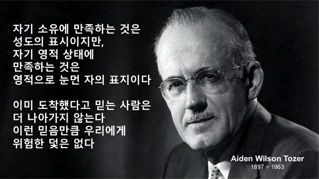지난주에 소개해 드렸었던 ‘에이든 토저(Aiden Wilson Tozer, 1897~1963)’의 『신앙의 기초를 세워라』는 책에서 이렇게 말합니다. “자기 소유에 만족하는 것은 성도의 표시이지만, 자기 영적 상태에 만족하는 것은 영적으로 눈먼 자의 표지이다. 이미 도착 했다고 믿는 사람은 더 나아가지 않는다. 이런 믿음만큼 우리에 게 위험한 덫은 없다”