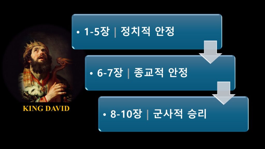 - [6~7장]은 하나님의 법궤를 예루살렘 다윗 궁으로 모셔 오면서 이스라엘이 신정 왕국임을 선포하며, 하나님 중심의 <종교적 안정>을 가져왔습니다.