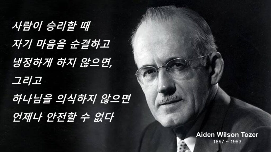 ‘에이든 토저(Aiden Wilson Tozer, 1897~1963)’는 “사람이 승리할 때 자기 마음을 순결하고 냉정하게 하지 않 으면, 그리고 하나님을 의식하지 않으면 언제나 안전할 수 없다” (신앙의 기초를 세워라. p.193) 라고 말했습니다.