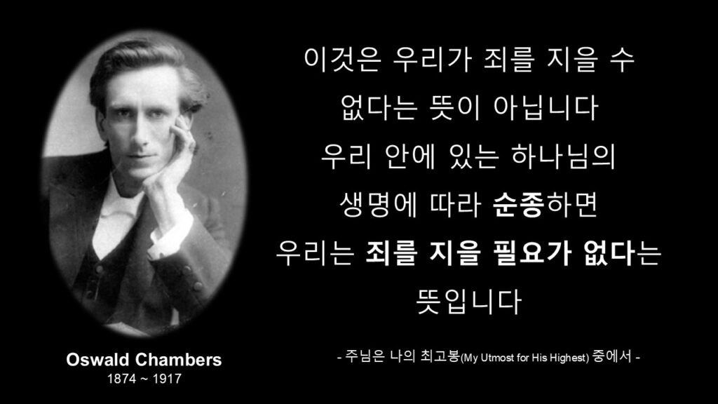 주님은 나의 최고봉(My Utmost for His Highest)』의 저자 ‘오스왈 드 챔버스(Oswald Chambers, 1874~1917)’는 이 요한일서 3장 9절 씀의 의미를 이렇게 해석합니다. 말 “이것은 우리가 죄를 지을 수 없다는 뜻이 아닙니다. 우리 안에 있는 하나님의 생명에 따라 순종하면 우리는 죄를 지을 필요가 없다는 뜻입니다”