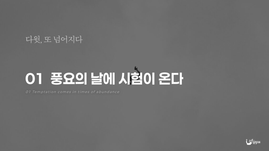 우리 인생에서 가장 풍요로울 때 , 아무 걱정이 없을 때 , 모든 것이 다 형통하기만 할 때 , 모든게 다 내 세상인 거 같을 때, 내가 가장 높은 자리에 있을 때… 바로 그때에 시험과 유혹이 온다는 것을 잊지 마십시오. 그래서 내 인생의 풍요의 날을 보내고 있을 때, 시험과 유혹을 경계하고 있어 야 하는 것입니다.