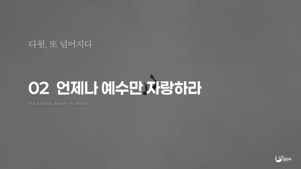 나는 우리 교회가 오직 예수만 자랑하길 바랍니다. 우리 교회가 크게 부흥 하고, 멋진 성전 건물 도 갖게 되고, 유명 해지는 날 이 온다고 할지라도… 썩고 없어질 것들이 결코 자 랑되어지지 않고, 오직 예수님만, 십자가만 자랑되어 지길 바랍니다. 그 누구도 예수님의 자리에 앉지 말아야 할 것입 니다. 예수를 자랑하지 않고, 복음을 자랑하지 않고, 사람이 자랑 되어지거나, 물질적인 것들이 자랑되어지기 시작할 때, 교회든 성도든 누구든 반드시 또 넘어지게 되어 있는것입니 다. ✓ “다윗, 또 넘어지다” – 예배자 다윗(12)